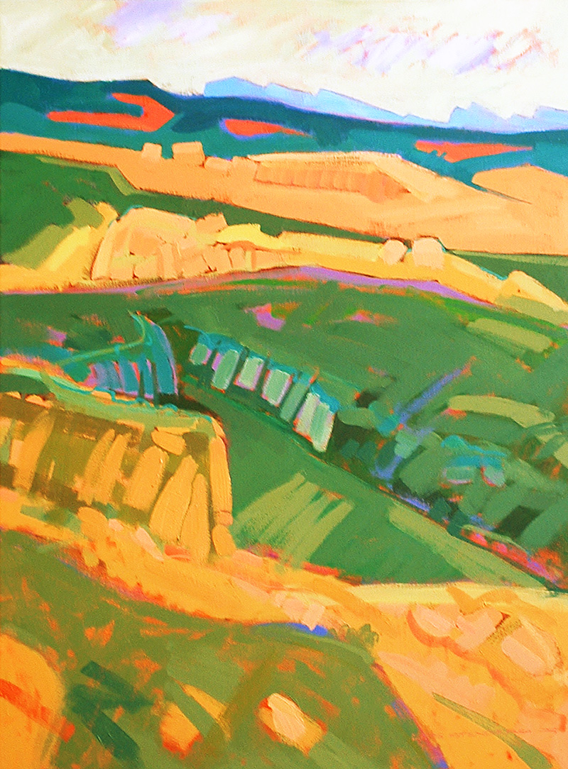 One of the first paintings I made in Australia. This was a result of my first visit to the Grampians. Now, there are Grampians back home in Scotland, but they’re nothing like these ones, despite Major Mitchell’s contention when he named them during one of his surveying expeditions for the British Empire. I was used to hills that were green and grey and covered in cloud or snow, or both. Vistas of glaucous forest canopy that stretched to the horizon broken only by red rocky outcrops were a new experience for me, so this early response contains more bravura than my later works. Everything here was new: the heat, the light, the colours… the snakes.