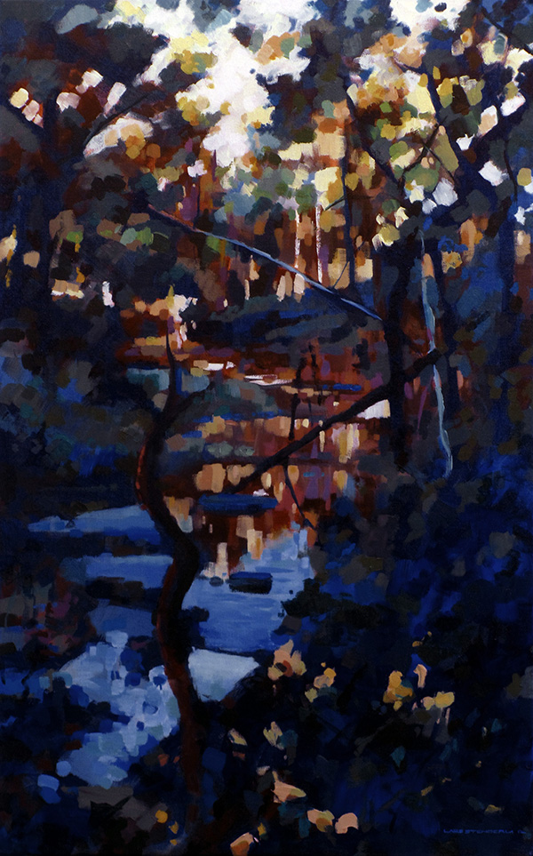 In some parts of the bush, even in the heat of summer, there is cool shade. This is a painting of Wombat Creek which flows through Wombat State Forest near Daylesford. I was going all-out for a tonal study here in just burnt umber and ultramarine, but a little extra colour crept in at the last moment.
