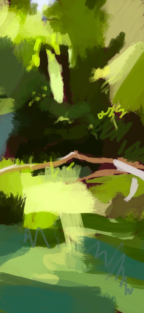 I’ve been asked if I made the paintings while I was walking. The answer is no, not exactly. I can’t carry all the materials on a through hike, so I take my iPad with ProCreate and sketch as I go (also my iPhone using ProCreate Pocket). The paintings are then made in the studio later and are a combination of memory, sketches and photos. I’m interested in how I felt when I was walking, and how I remember being in the landscape, so plein air is just one tool to get towards the finished work. The first day’s sketch of Whitby in the evening was on the iPad and there are a couple more to come but for now here’s a photo of me sketching on the phone, and the sketch itself. Three minutes to “get it down”. Not as quick as a photo, but priceless in terms of the editing that goes on between eye, brain and hand.
