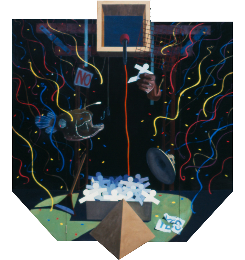 Below is a gallery of paintings from the 80s. You can see a theme emerging from the gloom of these terrible photographs. Shaped canvases, hinged panels, and a sort of surreal pop-art collaging on top of a dark still life stage. My favourite is probably Election Day: the dots on the angler fish are painted with luminous paint and glowed in the dark. There was no end to – depending on your point of view – my inventiveness, or my desperate quest for attention-seeking novelty. The side panels could fold shut like a sort of retable, and written on the reverse was a little passage about the angler fish which went something like: “so murky is the light at these depths that it will swallow anything that comes its way”. This and Tyrants Destroyed were among a half dozen paintings exhibited in the Cork Gallery in New York in about 1990. This was of course pre-internet and, stupidly, I didn’t keep any of the catalogues or reviews in the art papers of the time. There’s a lesson for you right there. Keep everything.