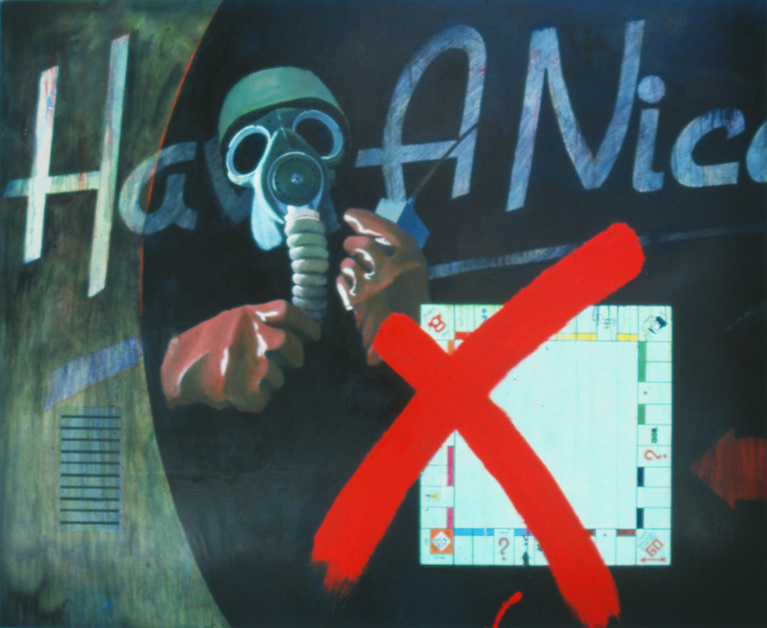 Tightly painted Monopoly boards represented destroyed cities; paper cutouts: hapless people; Spitting Image dog chew toys for Thatcher and Reagan; and a mushroom in a jar in When the Wind Blows, painted as we waited for the radiation cloud from Chernobyl to sweep over us. Happy days.