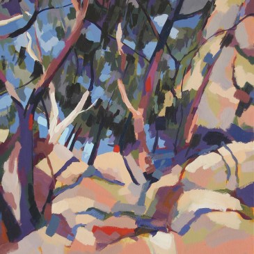 Another painting of heat and sunshine. Anyone might think it’s cold and raining outside at the moment. This painting was made in the fierce mid day heat in the You-Yangs, a group of hills near Geelong. Starting the walk earlier would have been smarter, but hey-ho, sometimes we just have to hike when we can hike … More Hot Day on the Dog Rocks