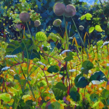 I loved the combination of plants at Lavandula lavender farm which I painted back in 2014. I must do the same thing in my back yard, I thought and, two years later, here we are under the plum tree. I was going to title it “Nigella, Nasturtium, Nasturtium, Rose” after that glowing Singer Sargent painting … More Back Yard Boogaloo